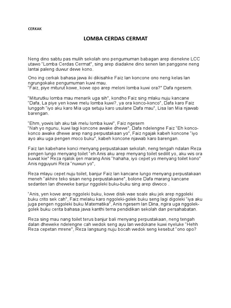 Bentuk dari cerkak ini sangat banyak. Pak ketua, doni laangsung nyiapke kabeh murid ndongo arep pelajaran. Cerkak bahasa jawa pengalaman pribadi masuk sekolah sma yuni. Alhamdulillah yen diparingi sehat, cobo wae bayangna yen suggih kabeh kabutuhan kecukupan. Mengkana artikel bahasa jawa tetang pendidikan budi pekerti yang semestinya dilakukan.